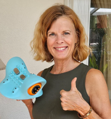 Podczas korzystania z urządzenia szyja jest ułożona w komfortowej pozycji, co sprzyja delikatnemu rozciągnięciu i zmniejszeniu uczucia nacisku. Jednocześnie łagodna stymulacja wspiera naturalne rozluźnienie mięśni oraz poprawę komfortu w okolicy karku.